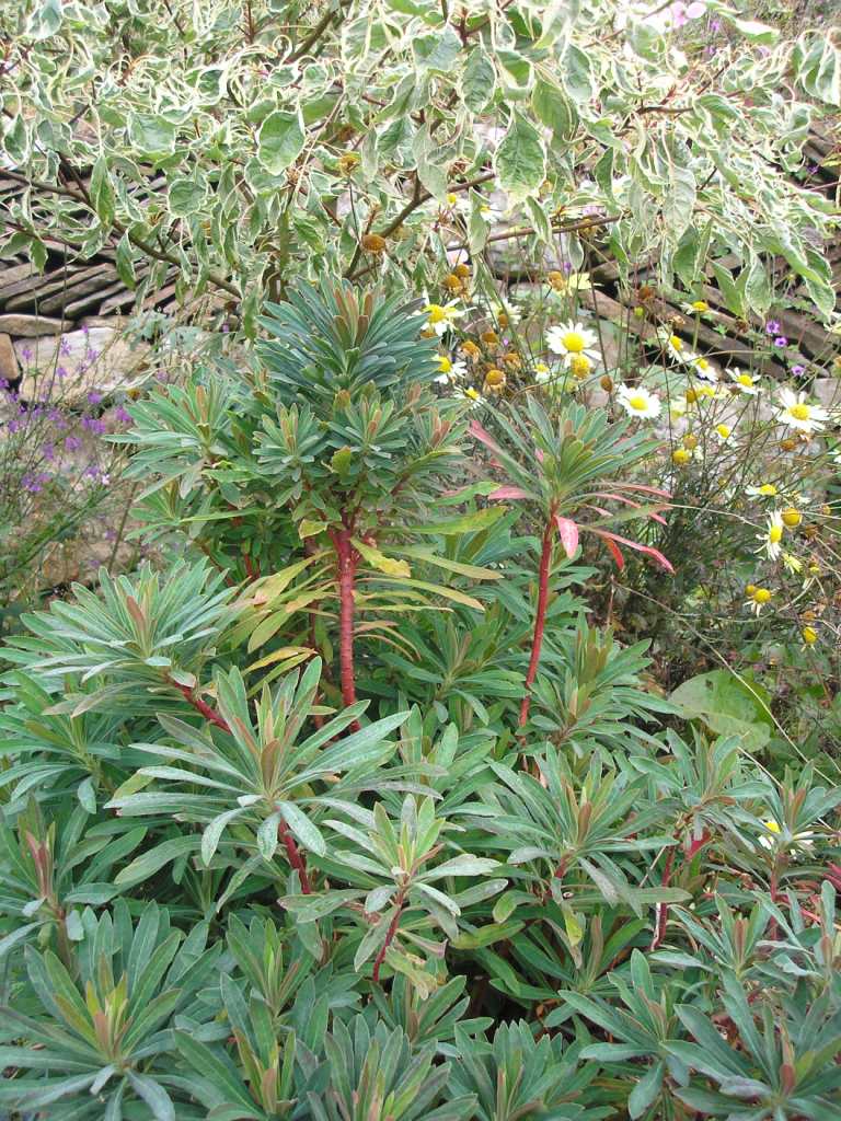 The red stems of lovely Euphorbia x martinii stand out under this Cornus controversa 'Variegata'